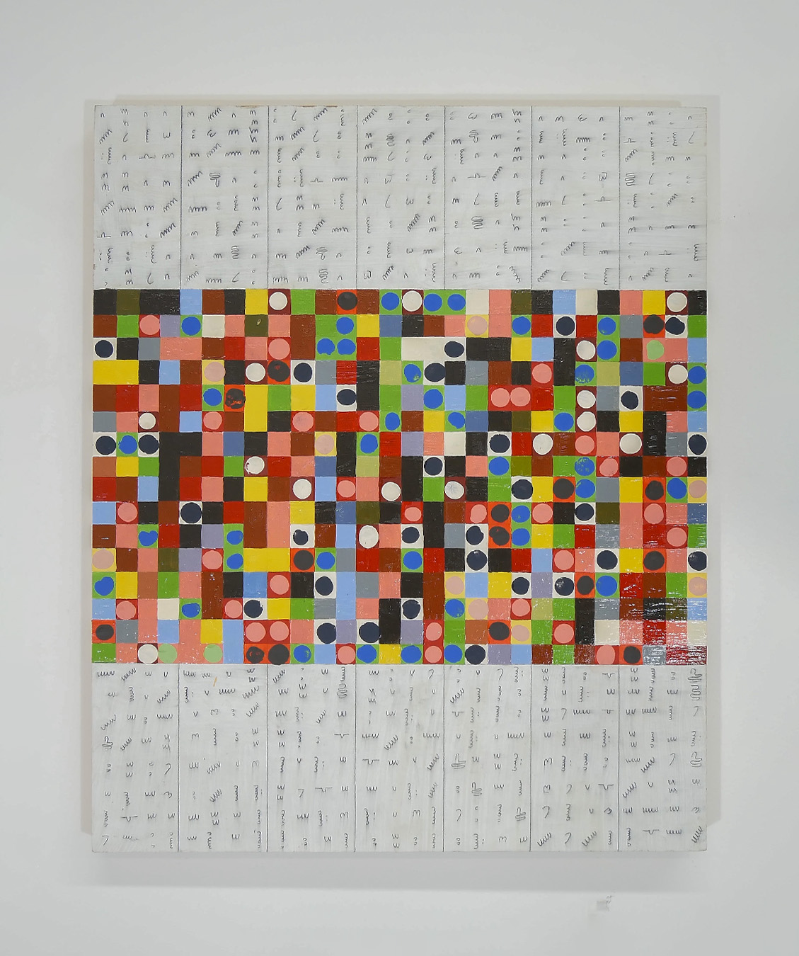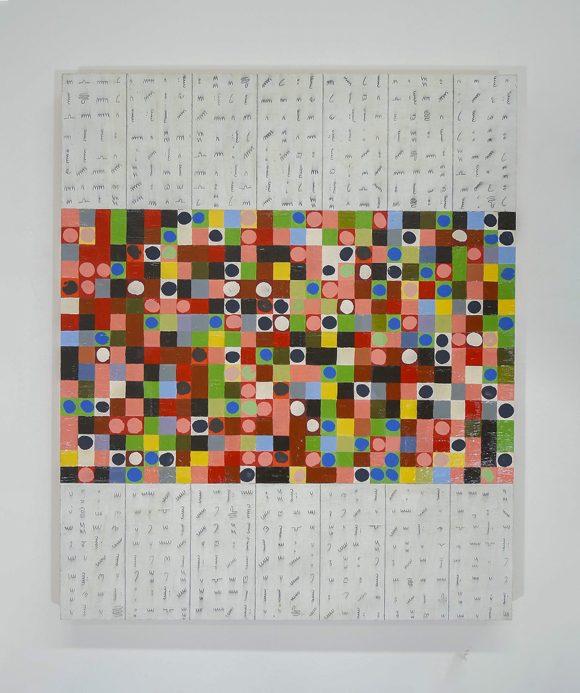 Acrylic, pencil, molding paste on panel.